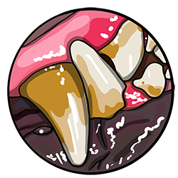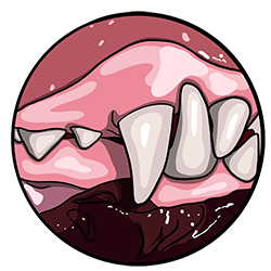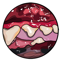 Infection below the gum line with secondary complications (tooth abscess; mobile teeth; heart, kidney & liver changes)